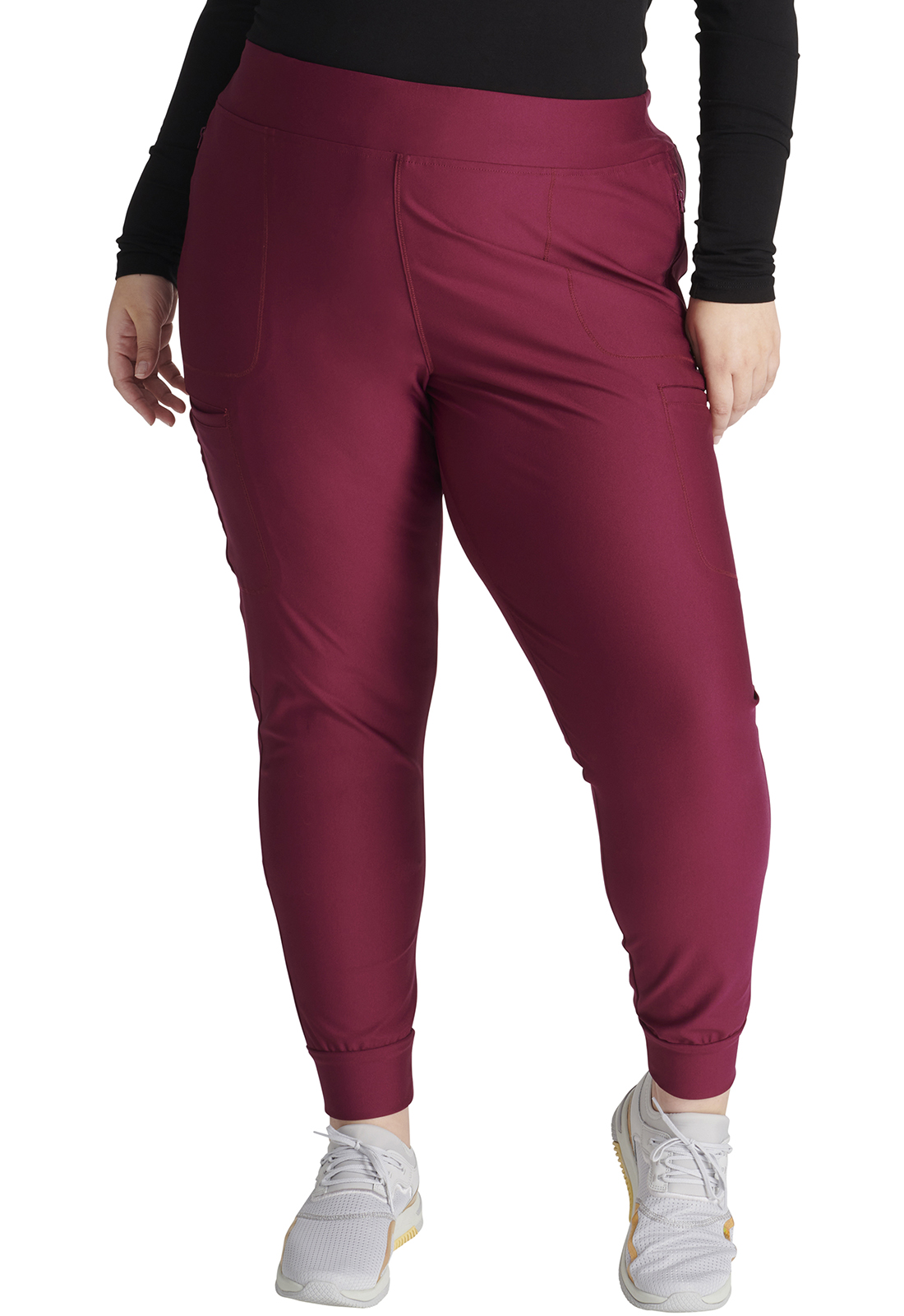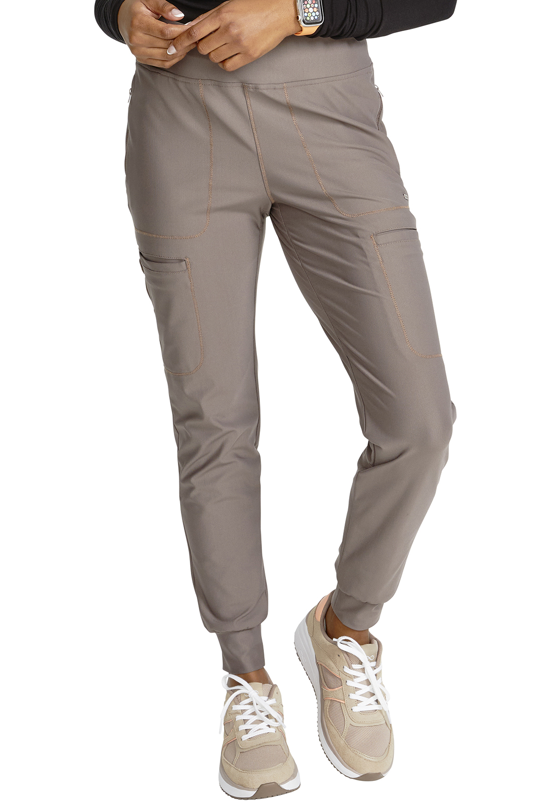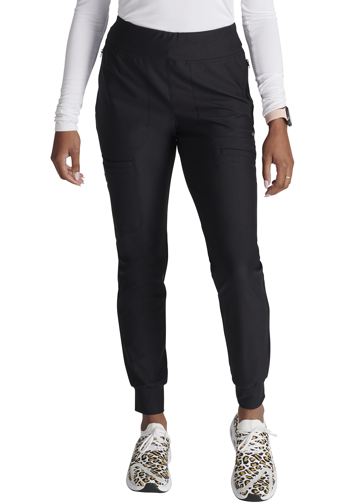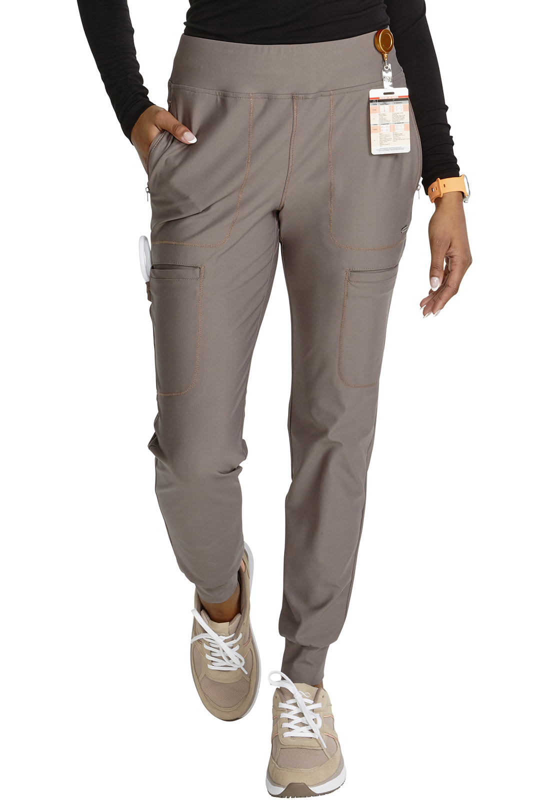 Брюки средней посадки современного кроя с эластичным поясом и внутренним шнурком для завязывания имеют утягивающие боковые панели от пояса до манжет, а также трикотажные манжеты. Брюки оснащены шестью карманами: двумя передними карманами на молнии, одним задним прорезным карманом, двумя прорезными грузовыми карманами и одним утилитарным карманом из сетки на левом грузовом кармане. Зауженные брючины, ширина 23 см. Длина по внутреннему шву: 66 см.