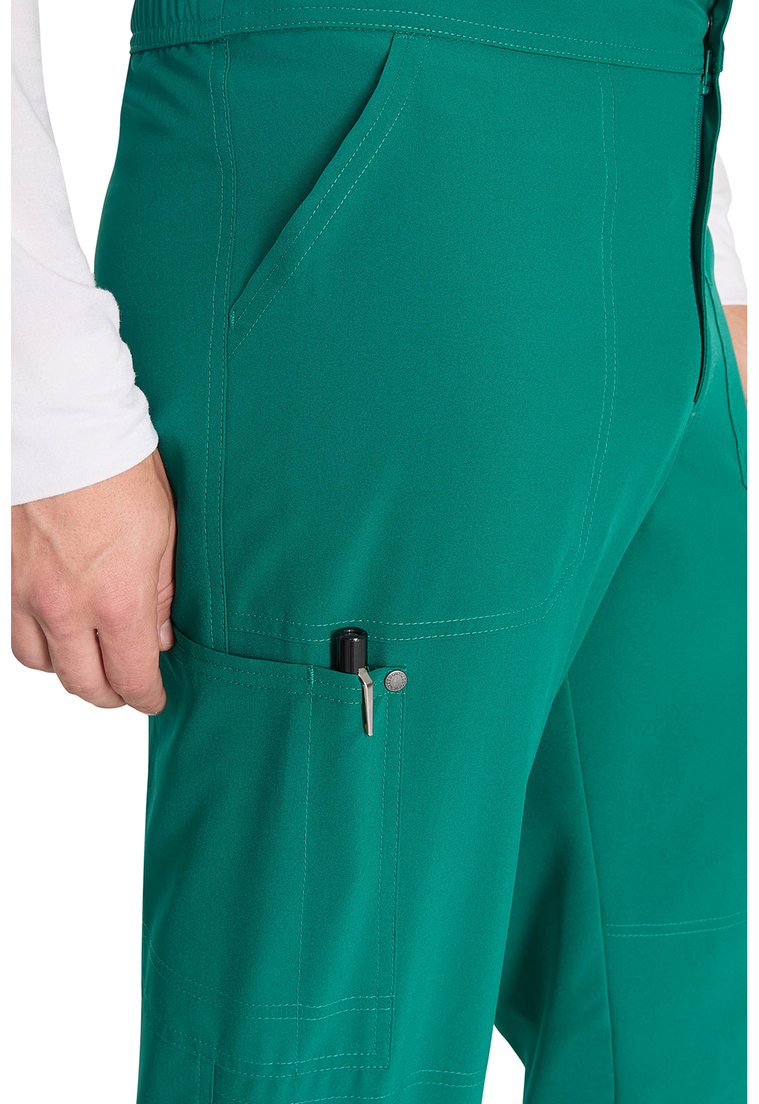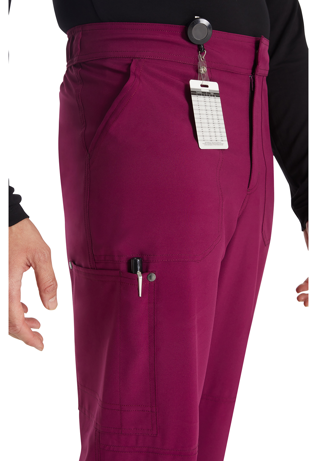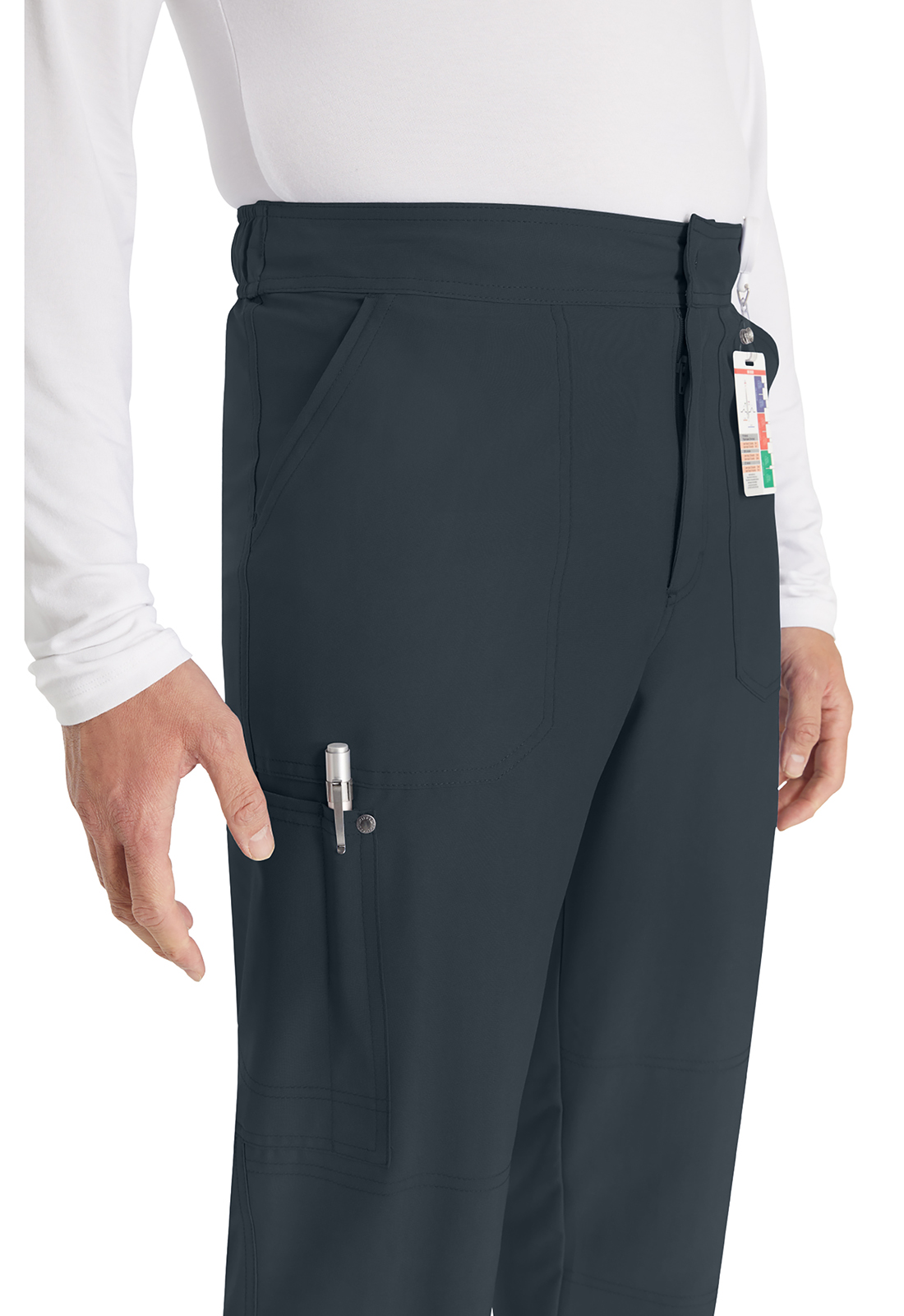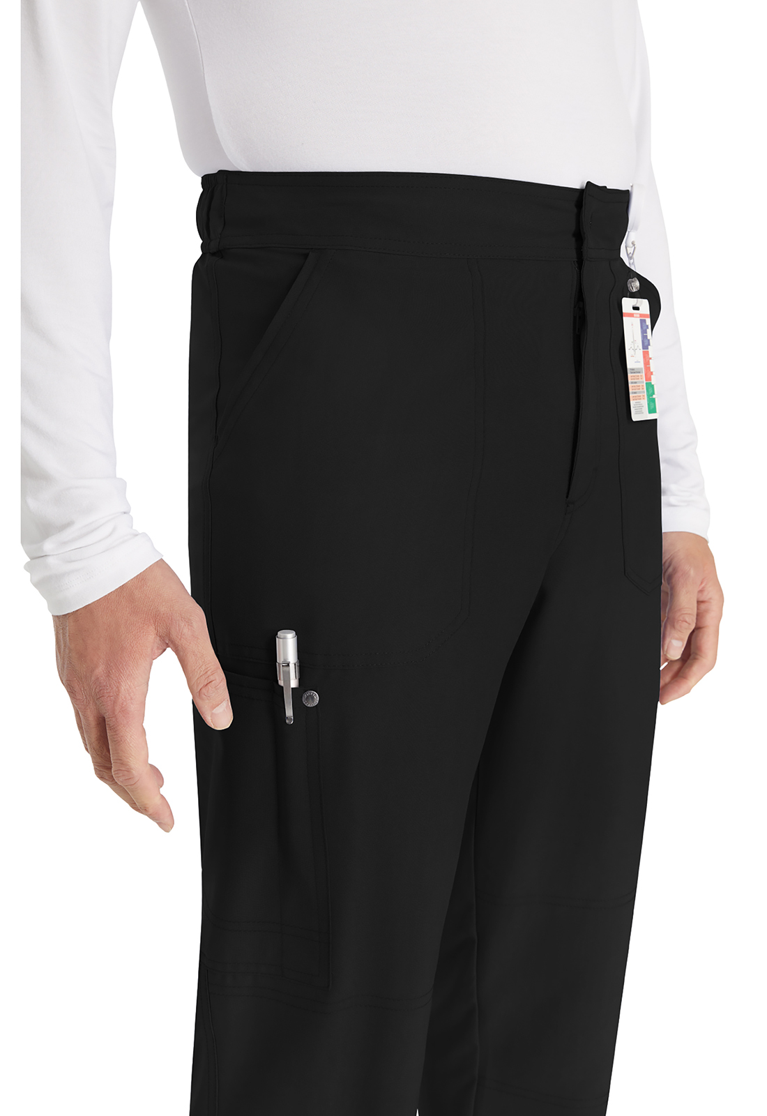 Брюки мужского кроя со средней посадкой имеют пояс, усиленный резинкой, с внутренним шнурком с логотипом для регулировки и надежной фиксации. Пояс на резинке с гульфиком на молнии и застежкой на кнопку с логотипом. В наличии четыре кармана для удобного хранения: два передних косых кармана и два накладных кармана с декоративной строчкой (правый — с петлей для ручки или инструмента). На углах накладных карманов — декоративные кнопки с логотипом. Декоративная строчка на коленях и всех швах для добавления стиля. На талии сзади — петля с логотипом для быстрого подвешивания. Прямые штанины с шириной 43 см. Длина по внутреннему шву: 75 см.