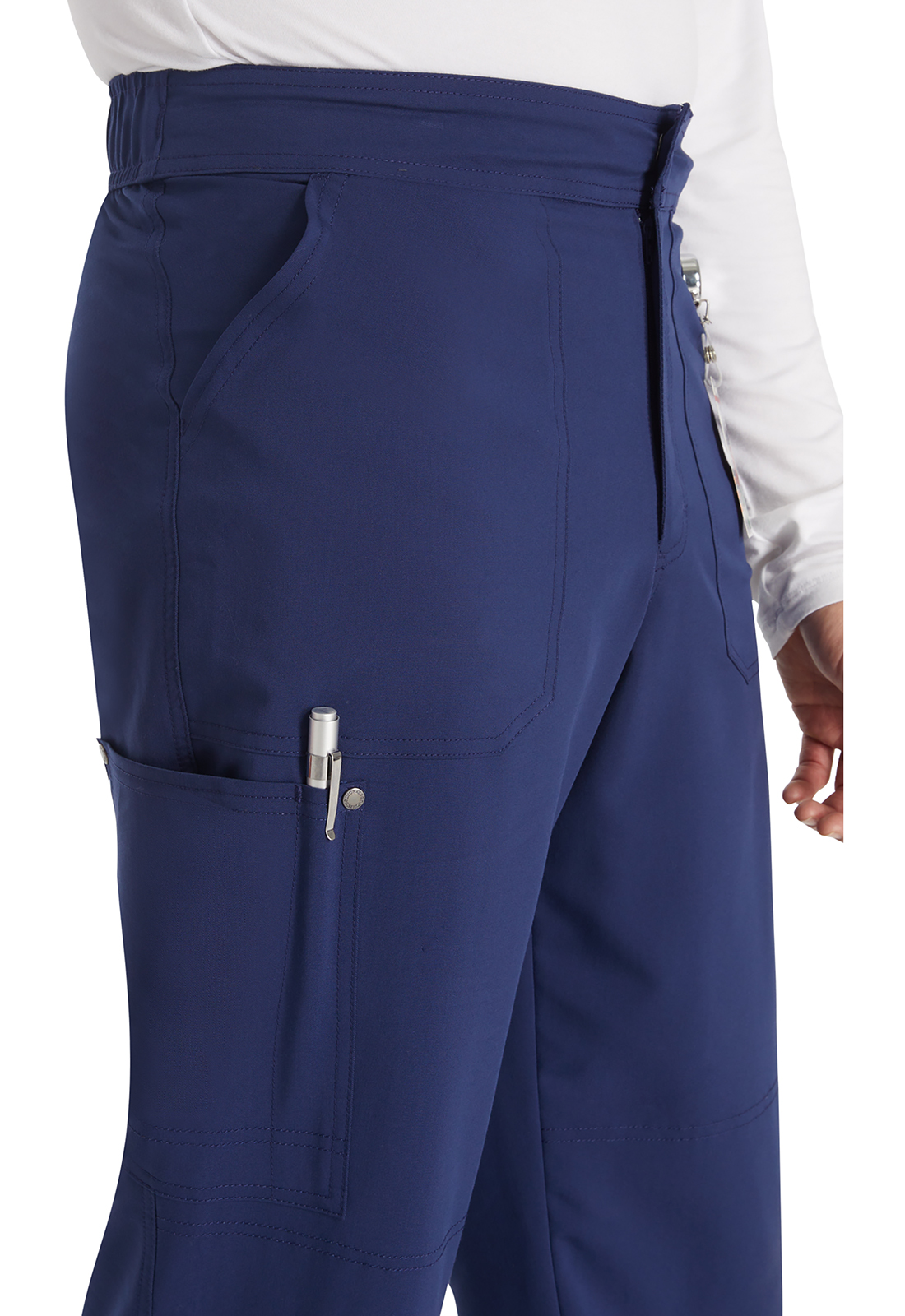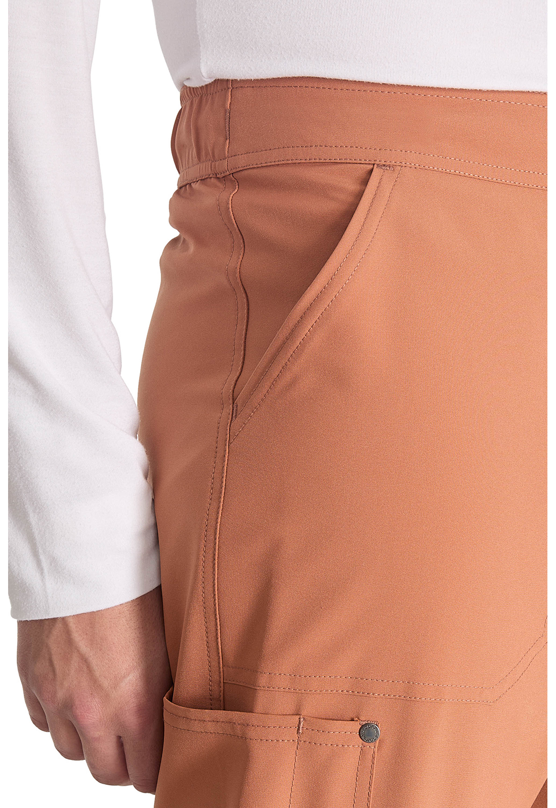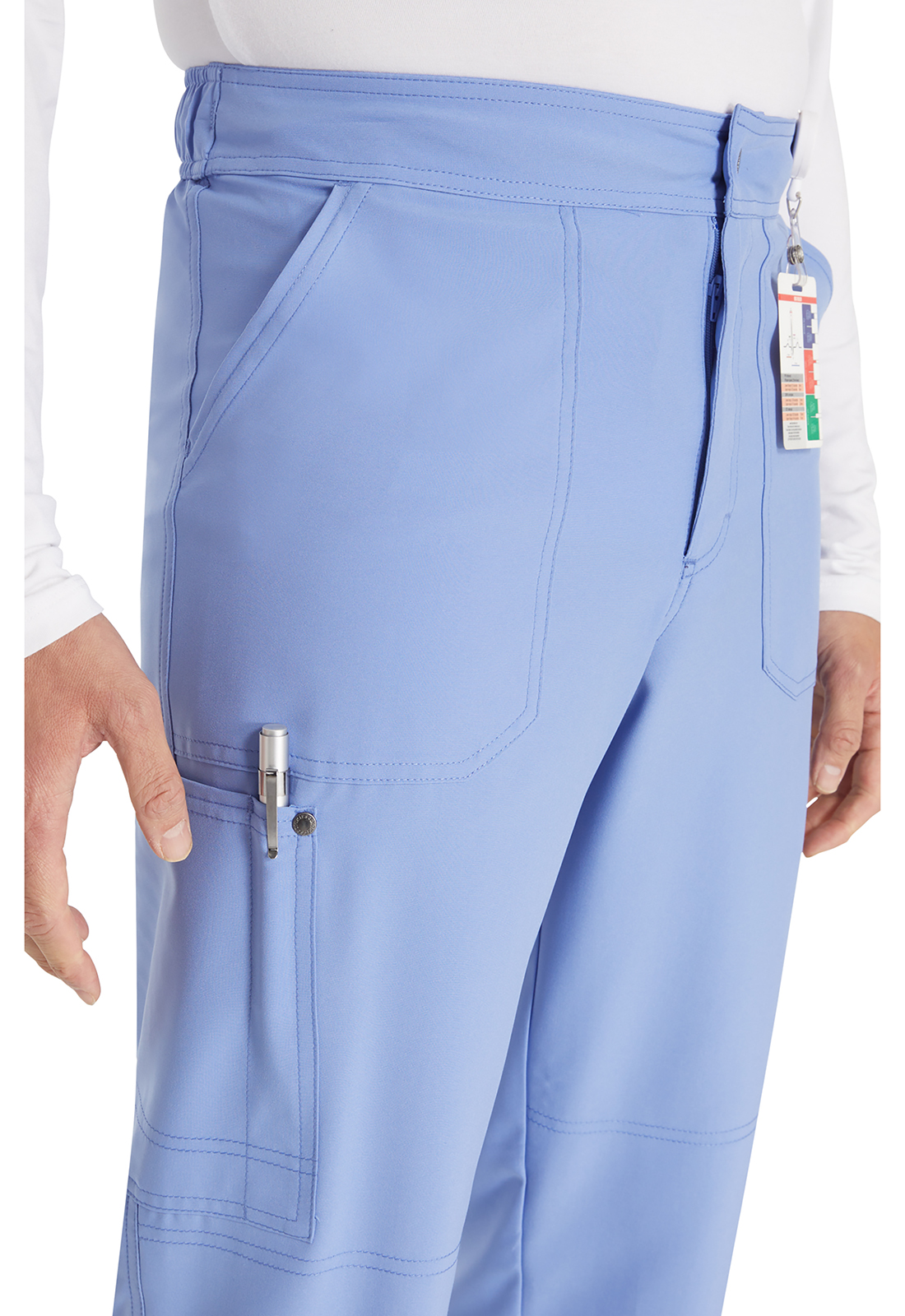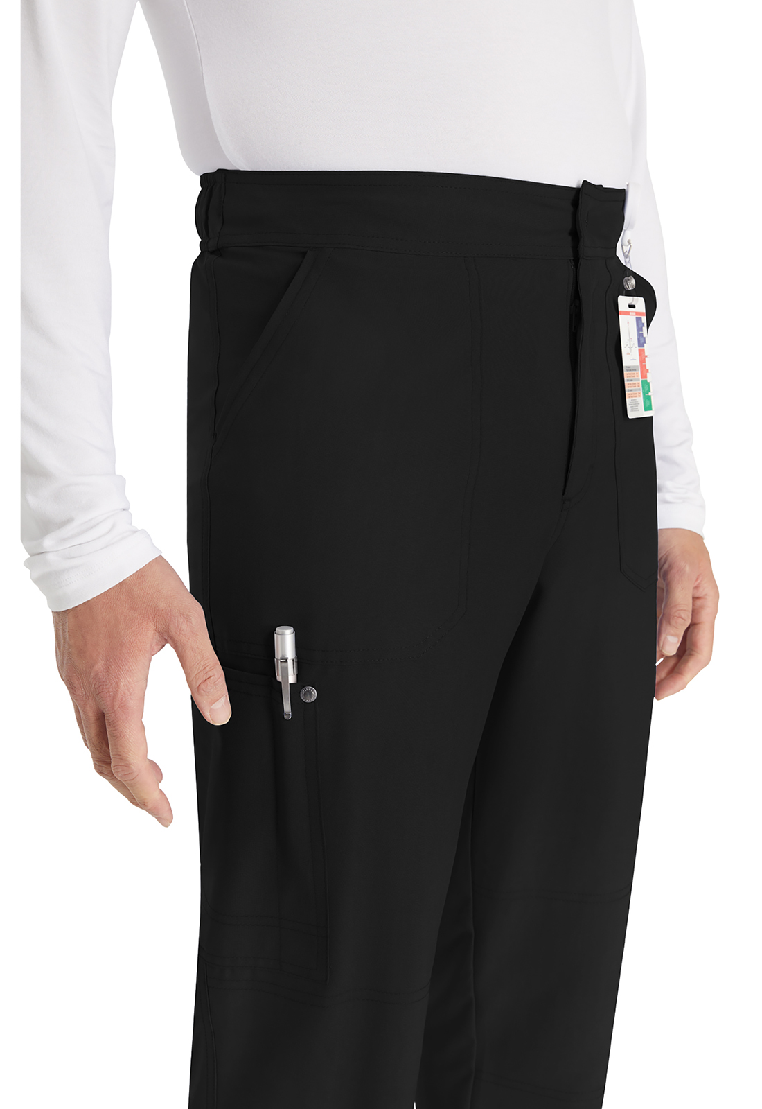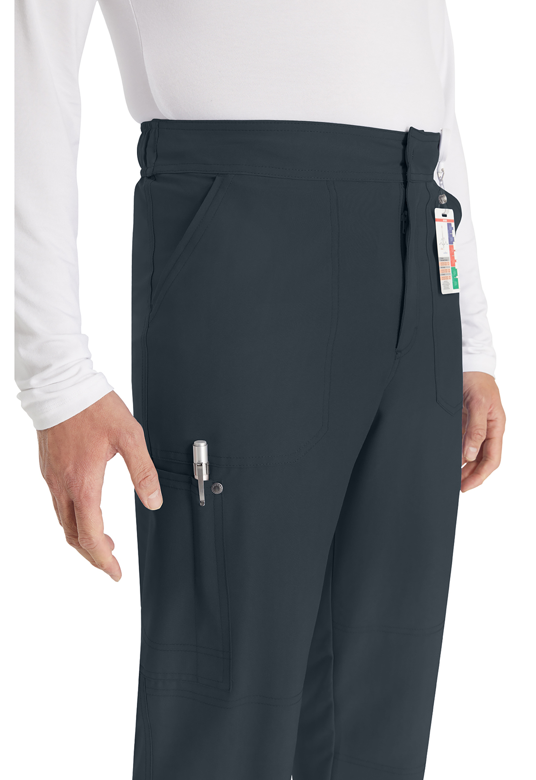 Брюки мужского кроя со средней посадкой имеют пояс, усиленный резинкой, с внутренним шнурком с логотипом для регулировки и надежной фиксации. Пояс на резинке с гульфиком на молнии и застежкой на кнопку с логотипом. В наличии четыре кармана для удобного хранения: два передних косых кармана и два накладных кармана с декоративной строчкой (правый — с петлей для ручки или инструмента). На углах накладных карманов — декоративные кнопки с логотипом. Декоративная строчка на коленях и всех швах для добавления стиля. На талии сзади — петля с логотипом для быстрого подвешивания. Прямые штанины с шириной 43 см. Длина по внутреннему шву: 89 см.