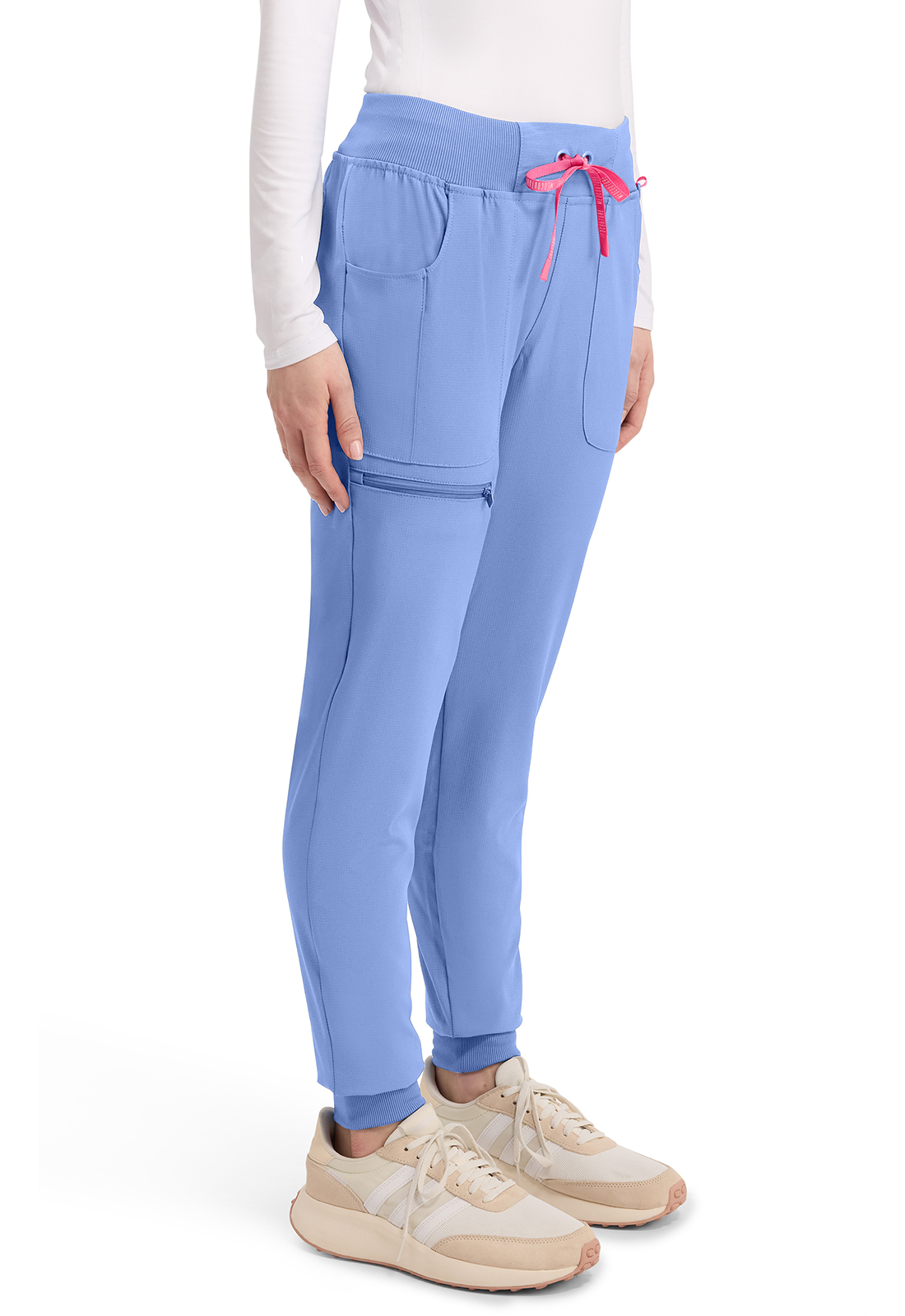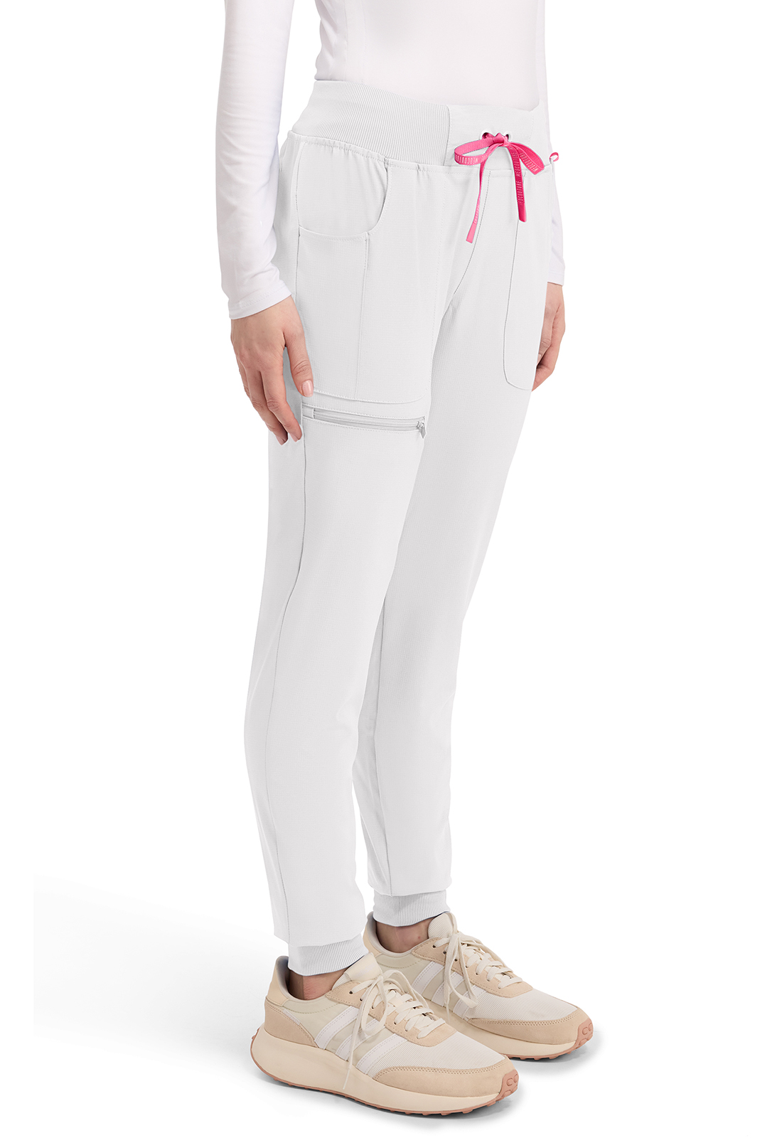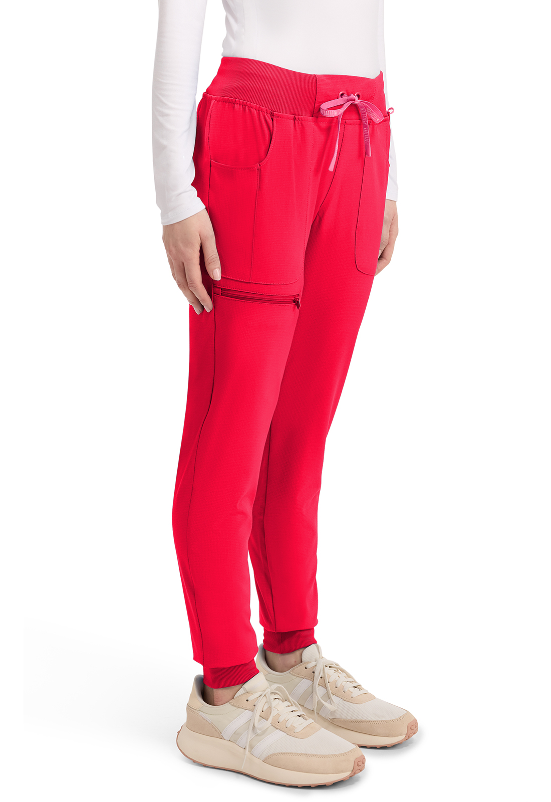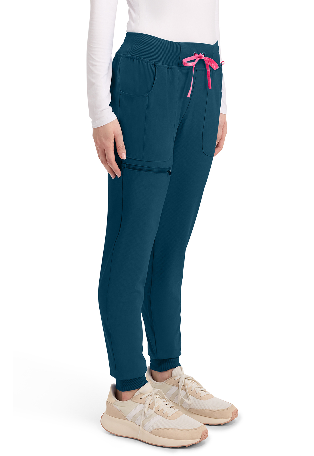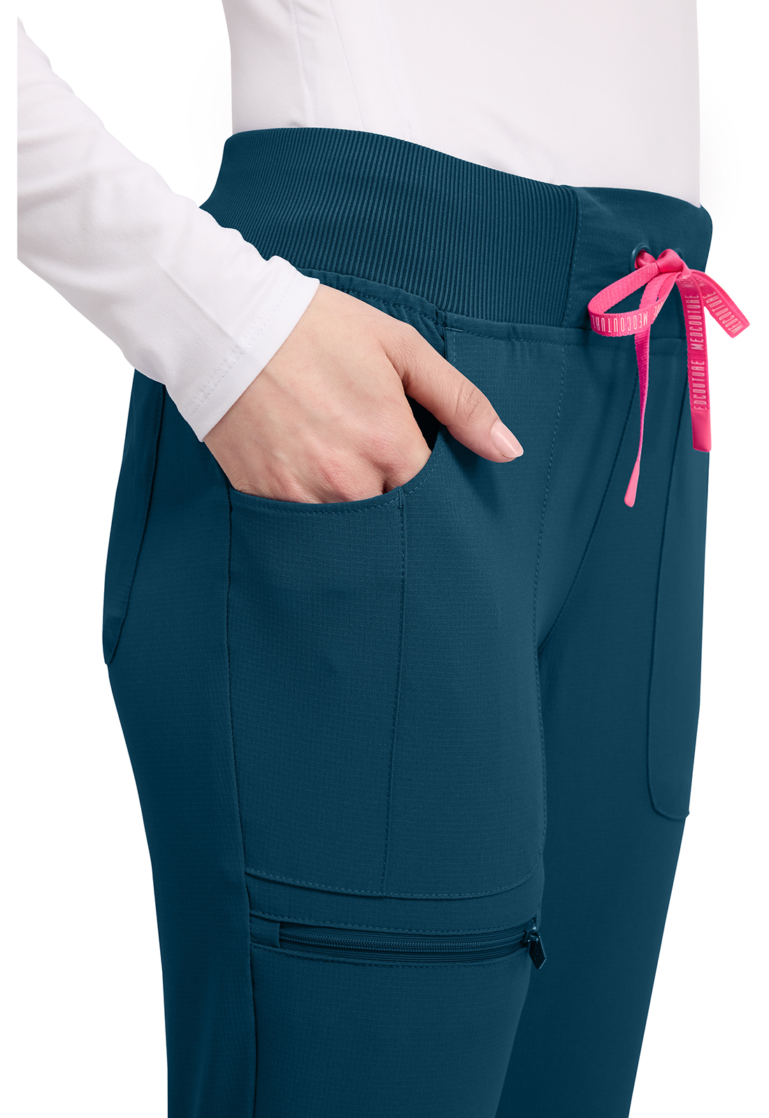 Женские джоггеры Missy средней посадки имеют ребристый эластичный пояс с подкладкой и шнурком в цвете с логотипом. На поясе есть карабин и петля для подвешивания на задней середине талии. Для организованного хранения предусмотрено пять карманов: два передних кармана (правый с отделением для ручки/инструмента), один карман на молнии, и два задних накладных кармана. Манжеты из ребристого материала в цвет брюк завершают их стиль. Конусообразные брючины джоггеров, открытие низа брюк 22 см. Длина по внутреннему шву: 67 см.