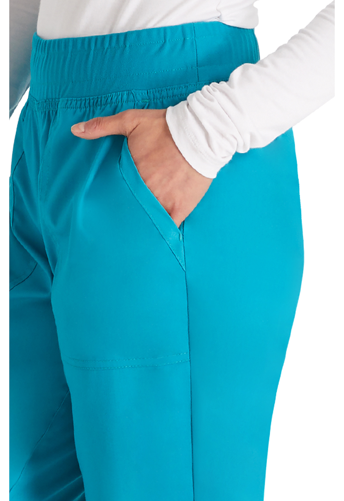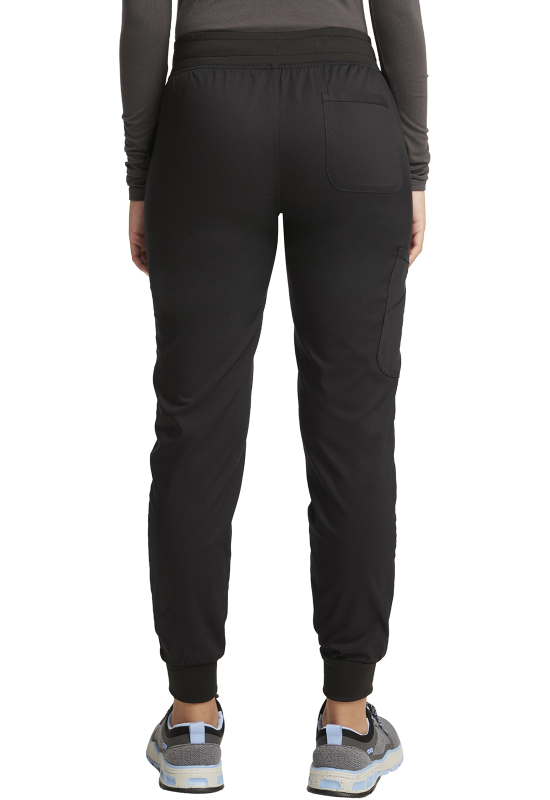This Modern Classic fit mid rise pull-on jogger has an encased elastic knit waistband with interior drawstring. There are five pockets: two front patch pockets, a double cargo pocket with a bungee ID badge loop, and one back patch pocket. The pant also features a tapered leg and knit cuffs. Leg opening: 9 1/2". Inseam: 26"