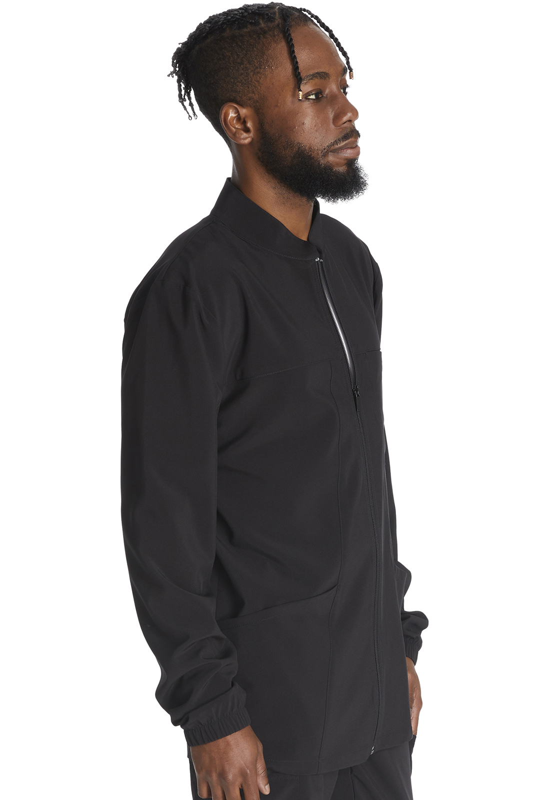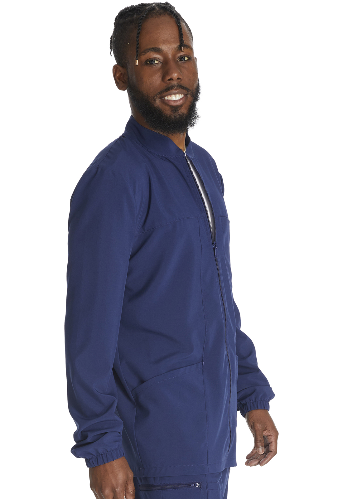 Мужская куртка на молнии спереди имеет стоячий воротник, стилизованные передние швы и центральный шов на спинке. В наличии три кармана для хранения: нагрудный карман в шве и два передних кармана. Манжеты рукавов отделаны внутренними эластичными вставками. Длина по центру спинки: 74 см..