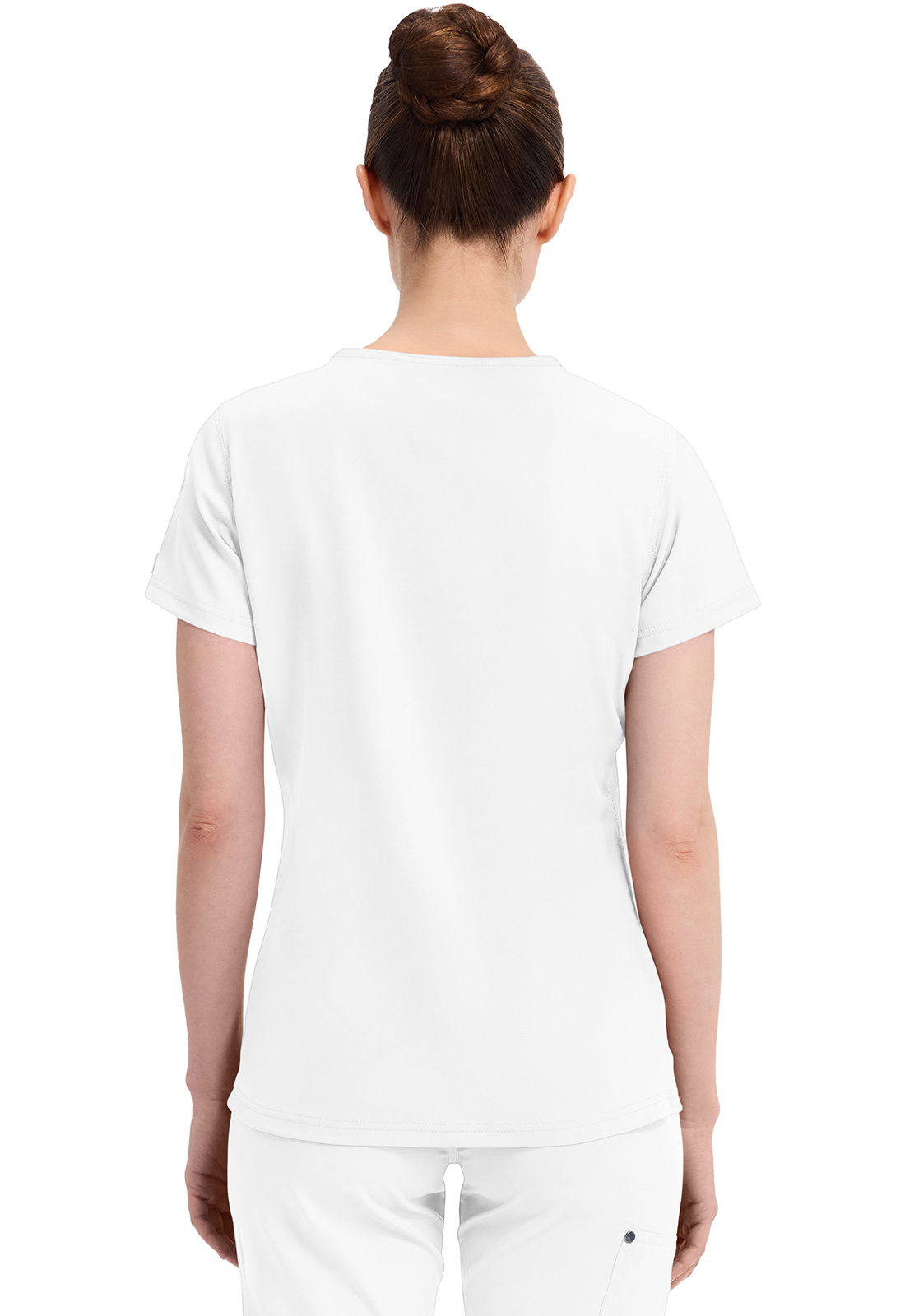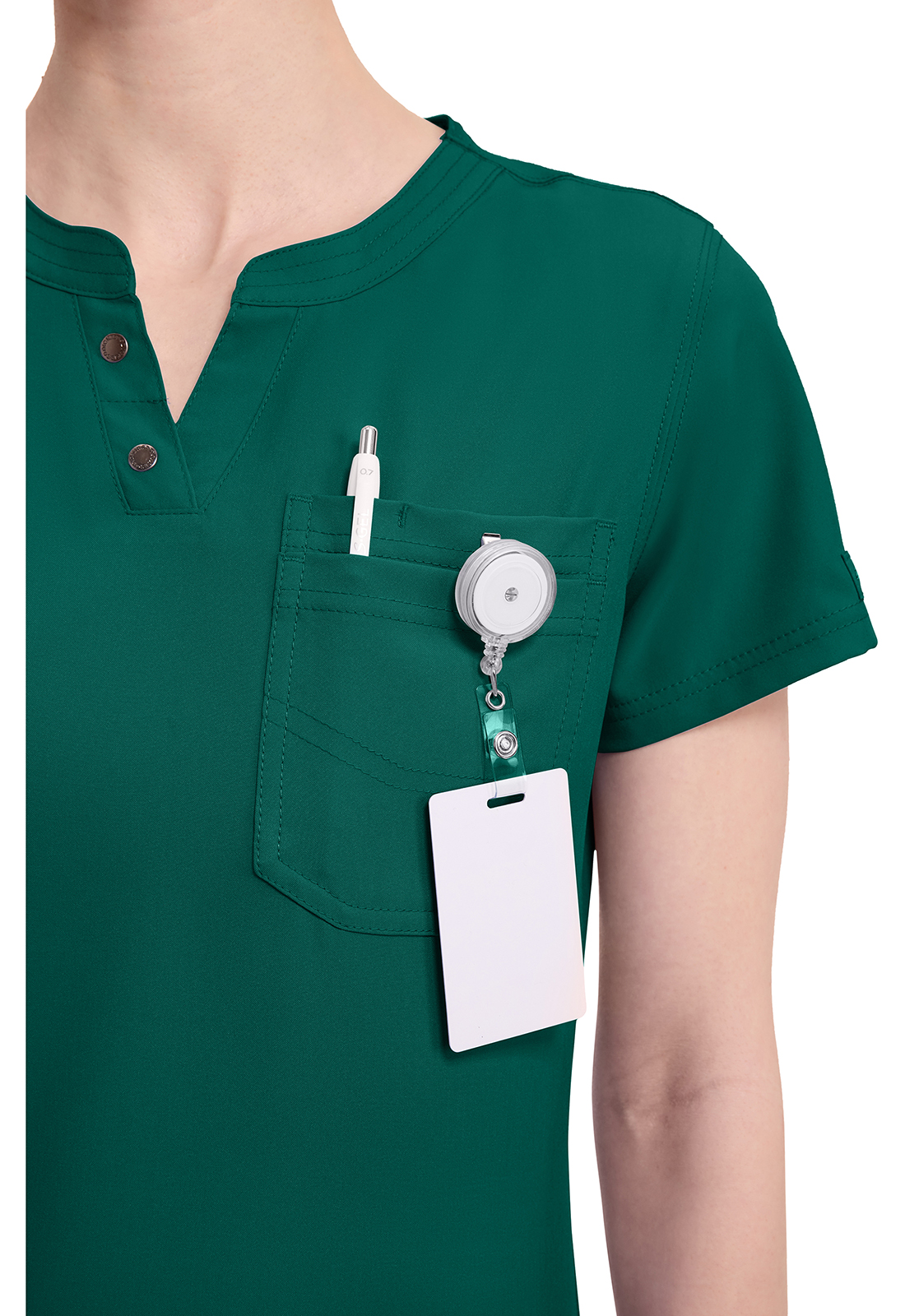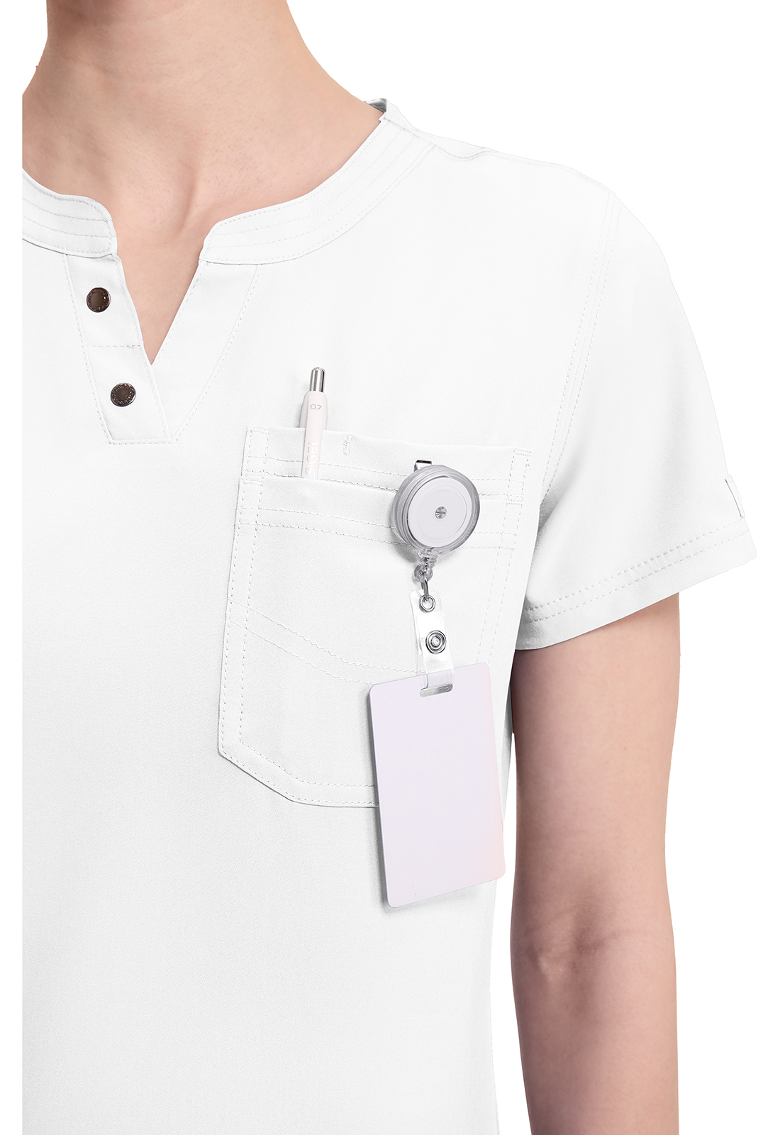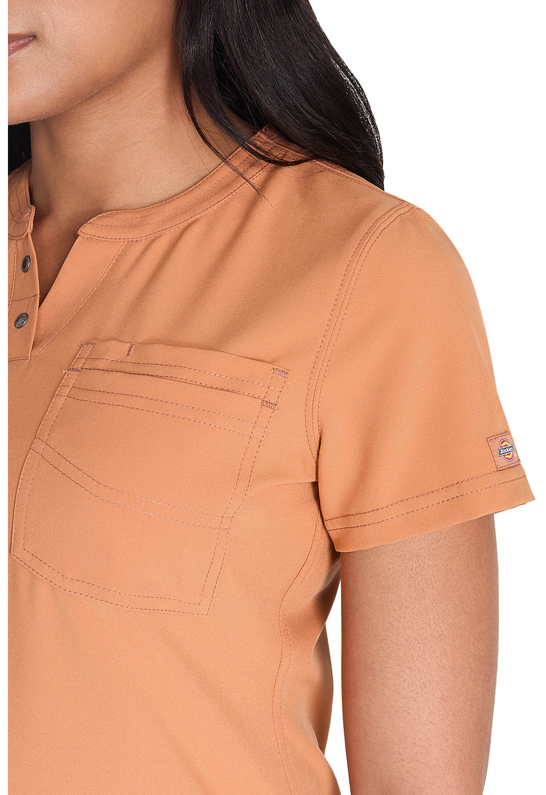 Топ современного покроя с круглым вырезом имеет воротник "хенли" с декоративными кнопками с логотипом на планке и многониточную строчку на горловине. В нем предусмотрен один нагрудный накладной карман с декоративной строчкой и закрепленным слотом для ручки или инструмента. Декоративная строчка на всех швах. Закругленный подол можно носить заправленным или не заправленным. Длина по центру спинки: 65 см.